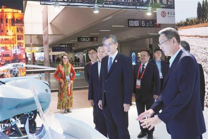 11月5日,自治区党委副书记、兵团党委书记、政委何忠友赴上海参加第八届进博会相关活动并到有关单位调研。这是何忠友在兵团展位察看参展企业展示产品。 兵团日报全媒体记者 李柏成 摄