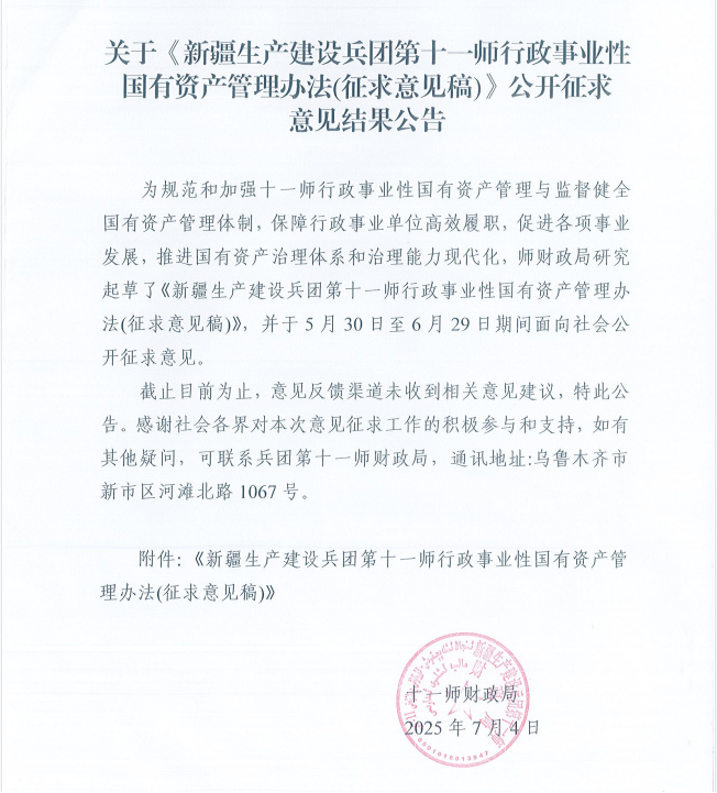 关于《新疆生产建设兵团第十一师行政事业性国有资产管理办法(征求意见稿)》公开征求意见结果公告