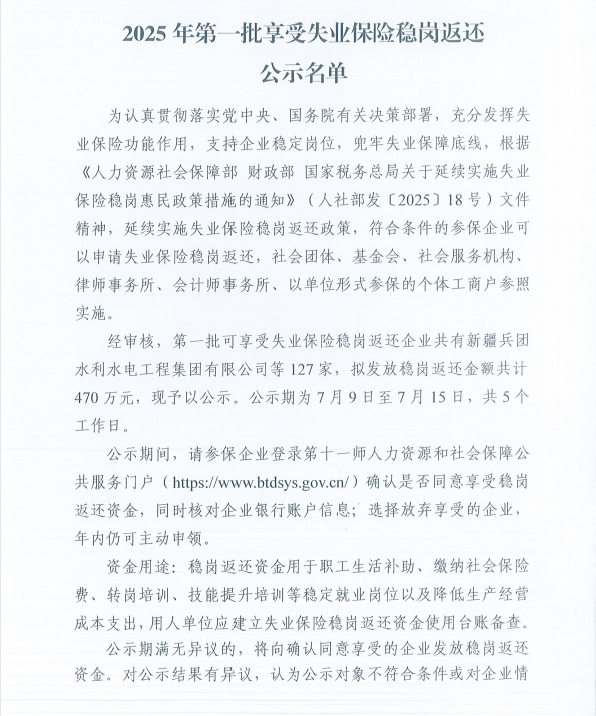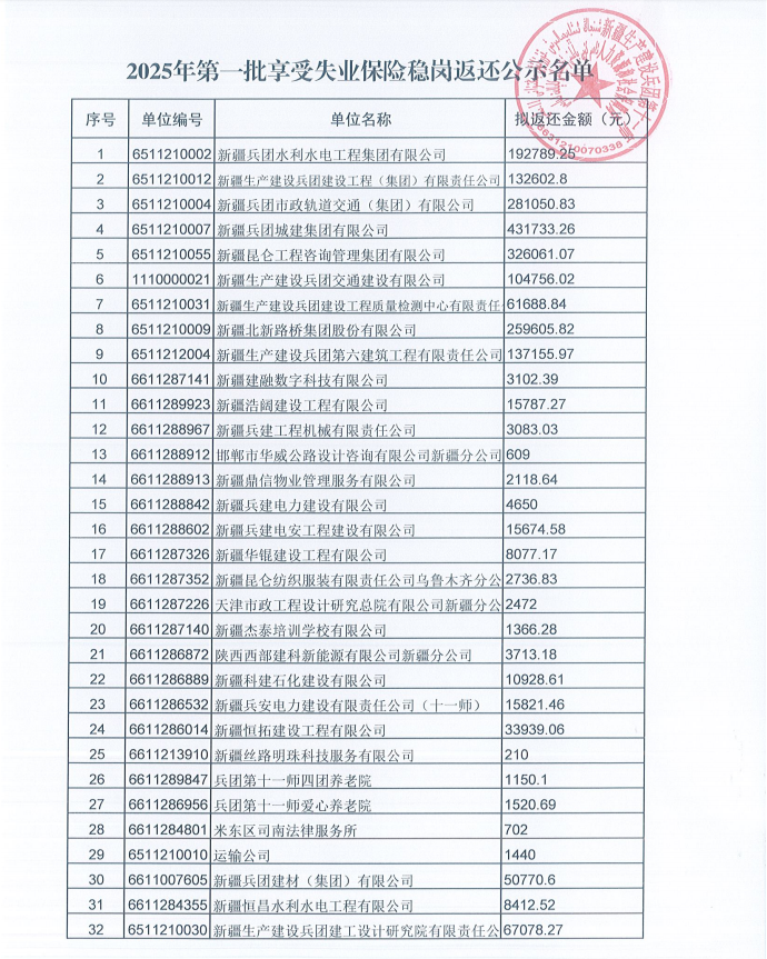 2025年第一批享受失业保险稳岗返还公示名单