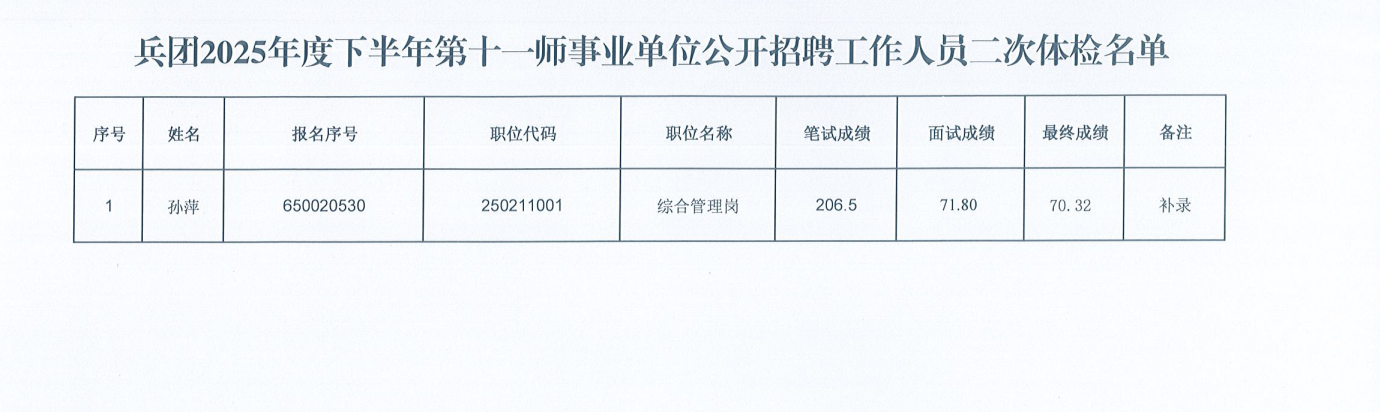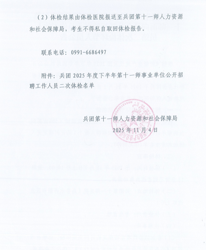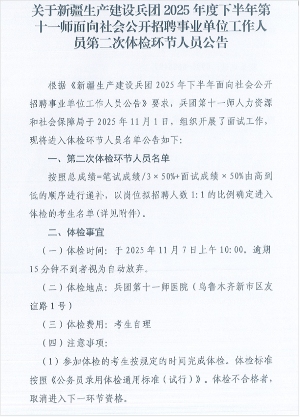 关于新疆生产建设兵团2025年度下半年第十一师面向社会公开招聘事业单位工作人员第二次体检环节人员公告