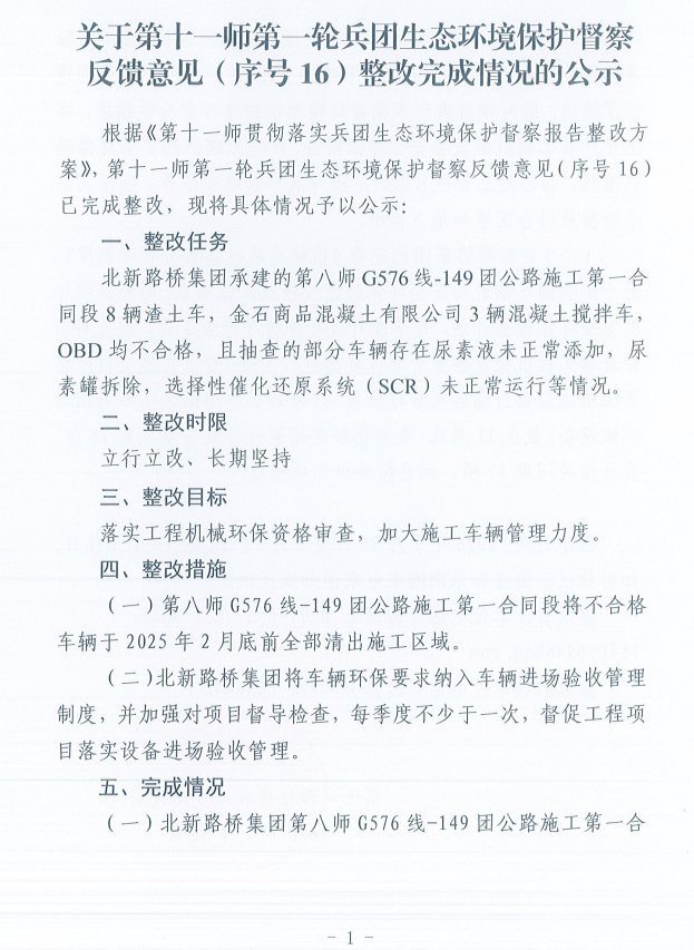 关于第十一师第一轮兵团生态环境保护督察反馈意见(序号16)整改完成情况的公示